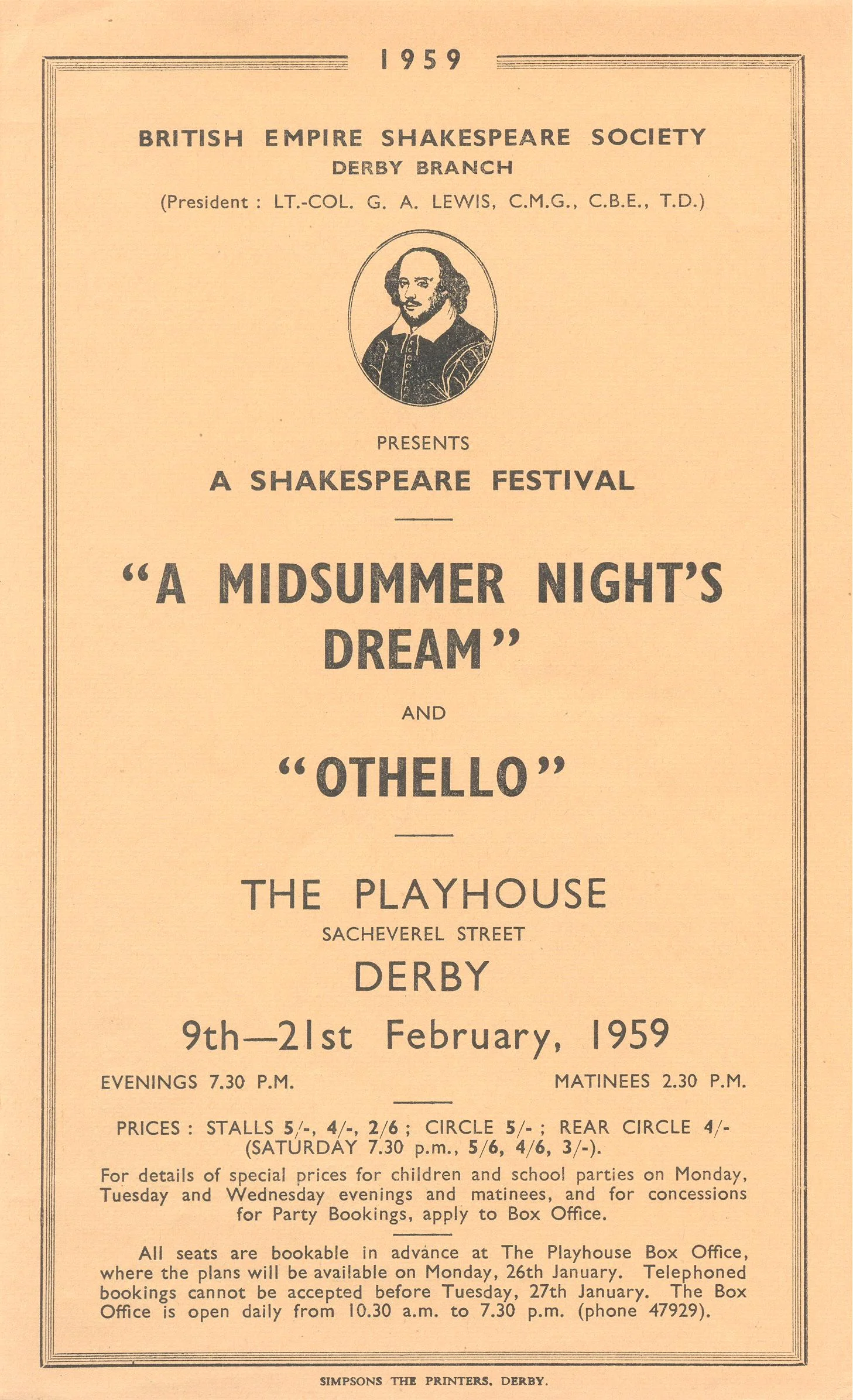 This was the 5th time we had presented a production of 'A Midsummer Night's Dream' and the show featured incidental music by Mendelssohn. The production of 'Othello' was our third and used costumes by B. J. Simmons & Co. Ltd. and wigs for the female characters provided by Gustave.