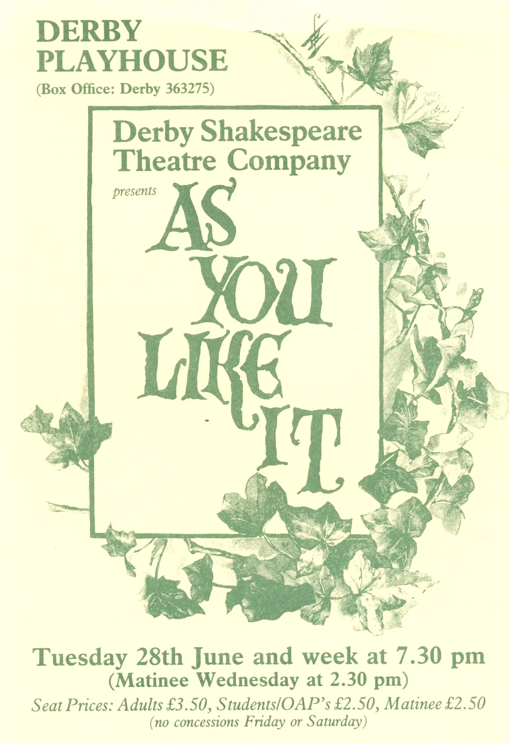 DSTC brought all the romance, mystery and laughter of the Forest of Arden to the Derby Playhouse stage in Phillip Beeson's 1988 production of 'As You Like It', Shakespeare's classic comedy of courtship and love.