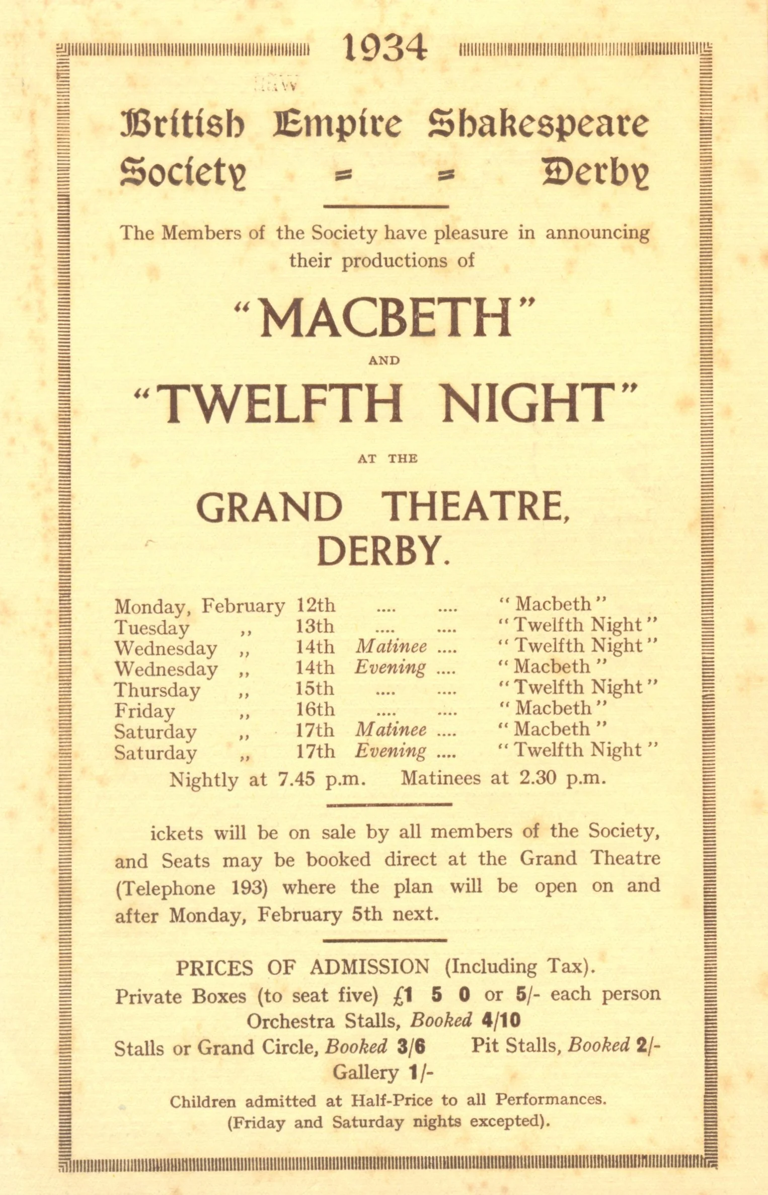 The two plays were performed in February, each alternating with the other between the matinee and evening performance of the day. This busy schedule was customary for the British Empire Shakespeare Society (Derby Branch), as we were then known, at the time.