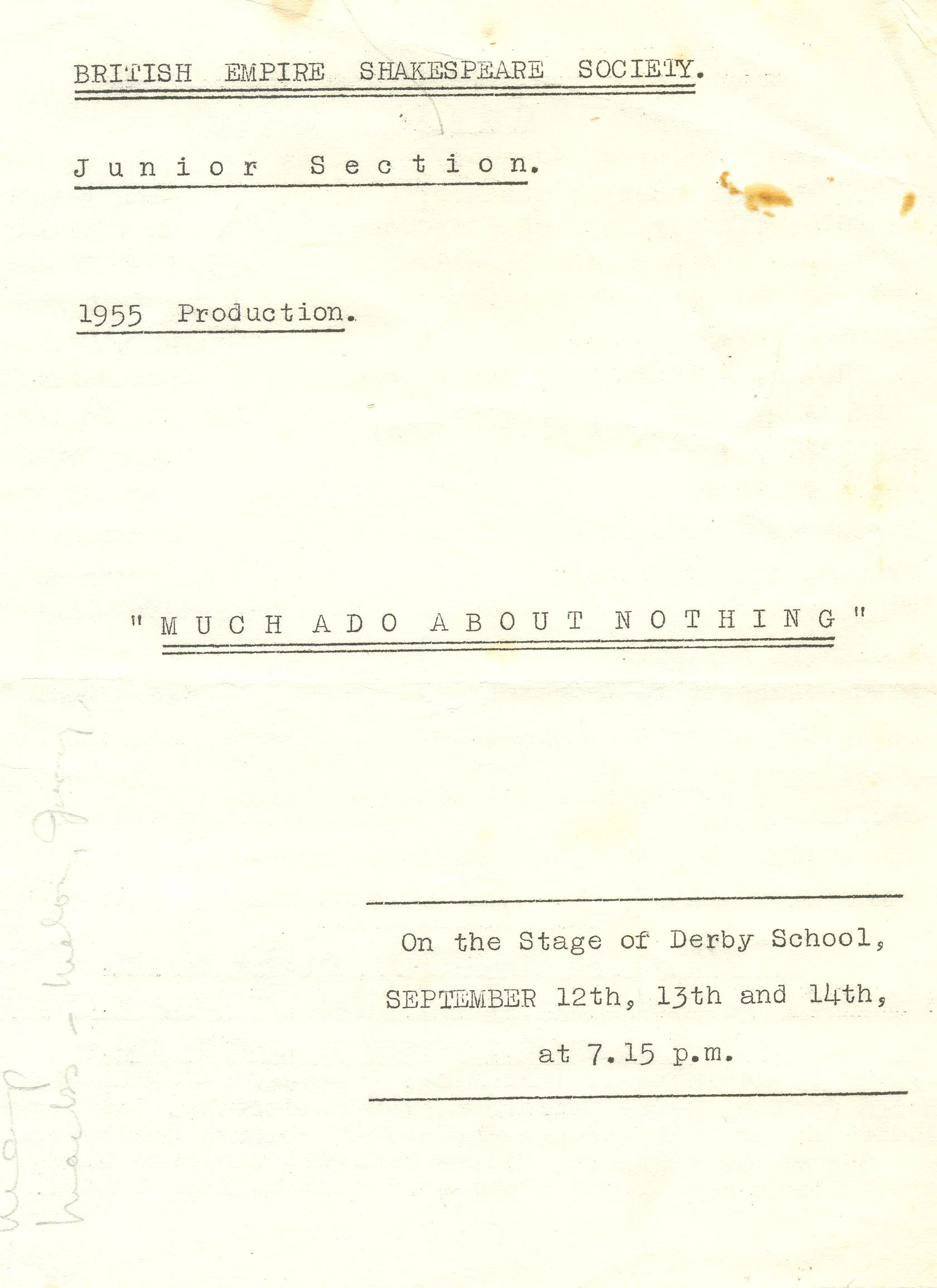 This 1955 production of Shakespeare's timeless story of bickering lovers Beatrice and Benedick was staged by the 'Junior Section' of what was then known as the British Empire Shakespeare Society (Derby Branch). The Junior Section produced several plays during the 1950s, often staged at local schools.