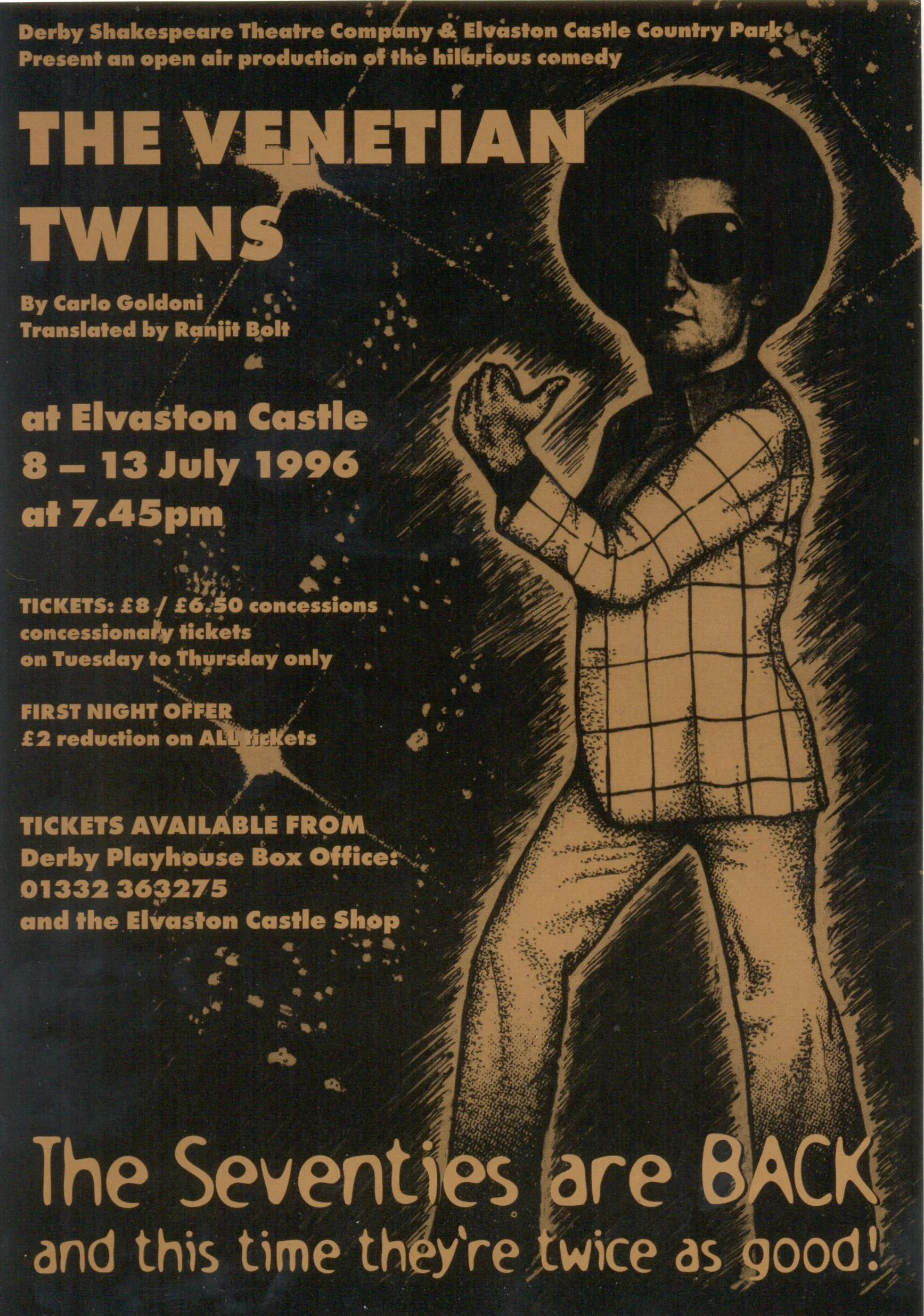 This wild and wonderful production of Carlo Goldoni's uproarious farce 'The Venetian Twins' brought all the style and madness of 1970s style to the grounds of Elvaston Castle in the summer of 1996.
