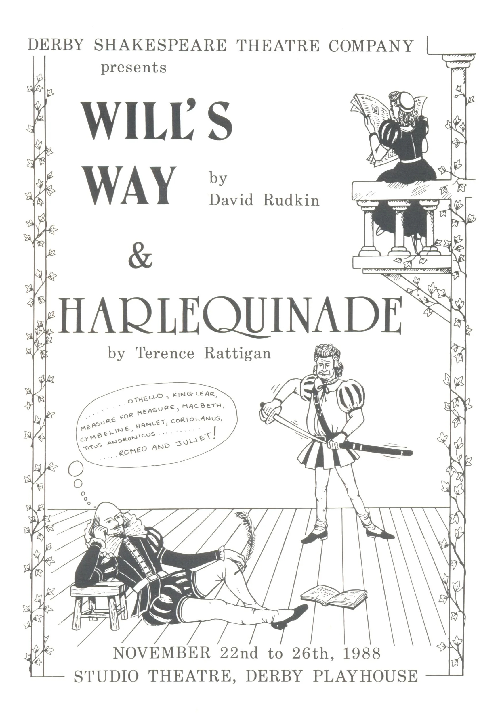 November 1988 saw us present a double bill of 'Will's Way', by David Rudkin, and Terence Rattigan's 'Harlequinade' at the Derby Playhouse Studio.